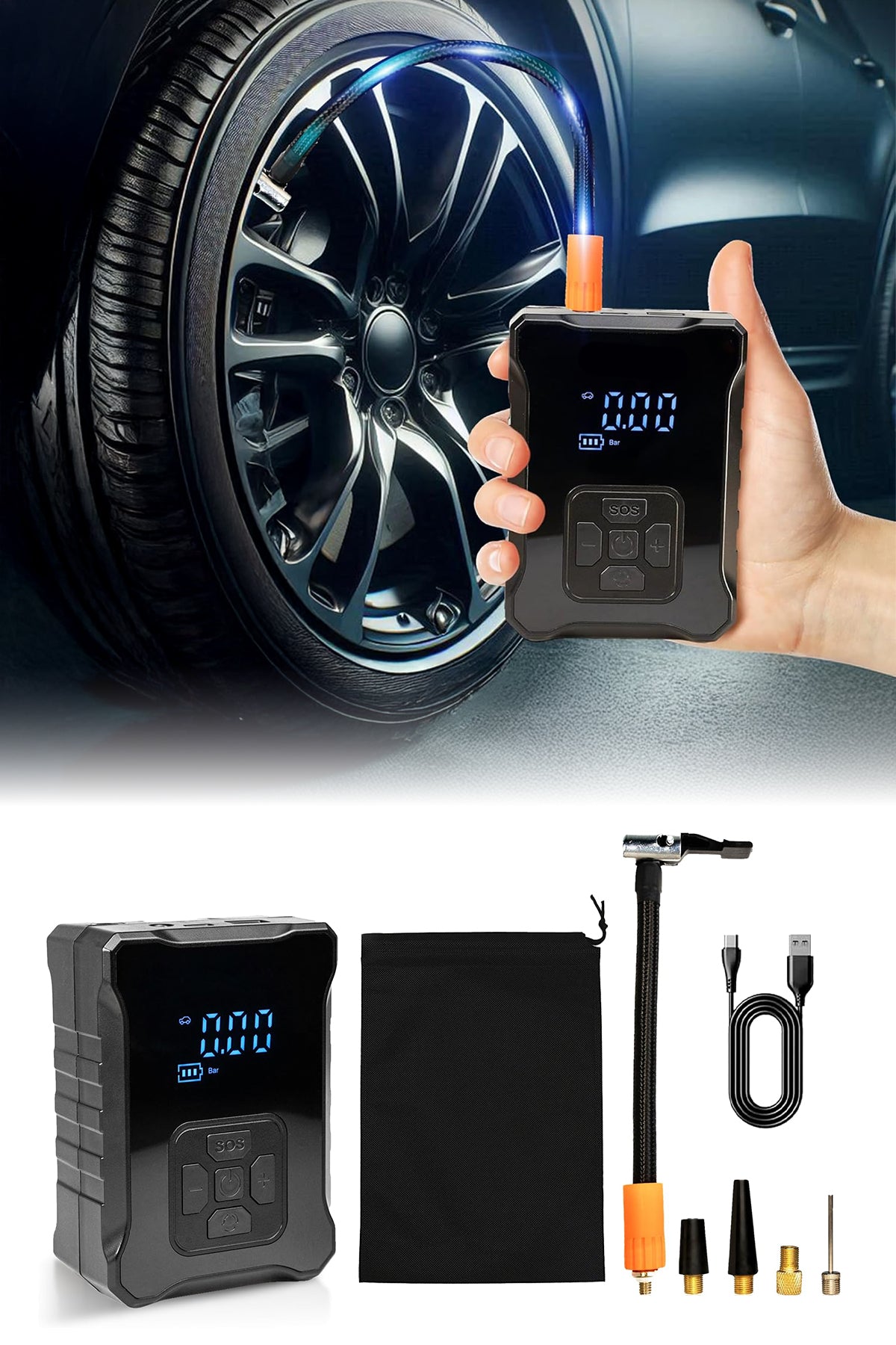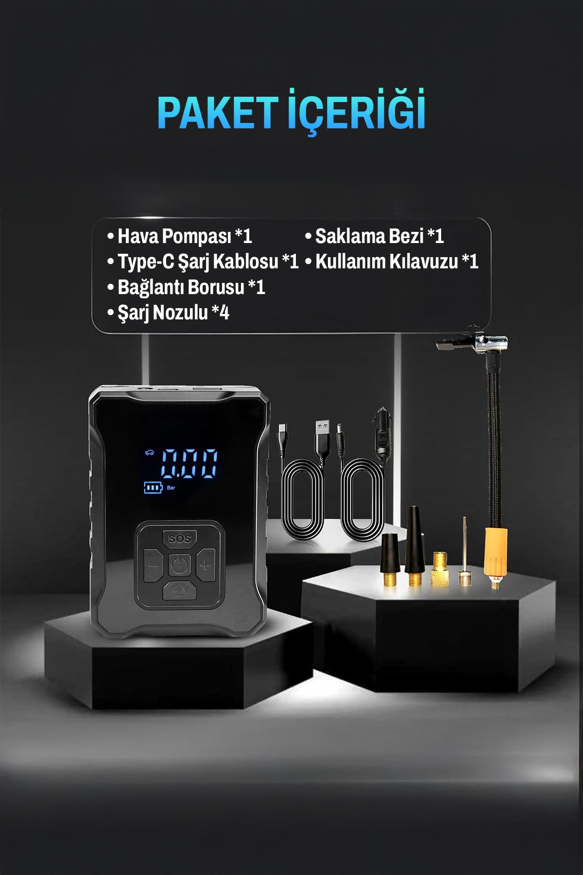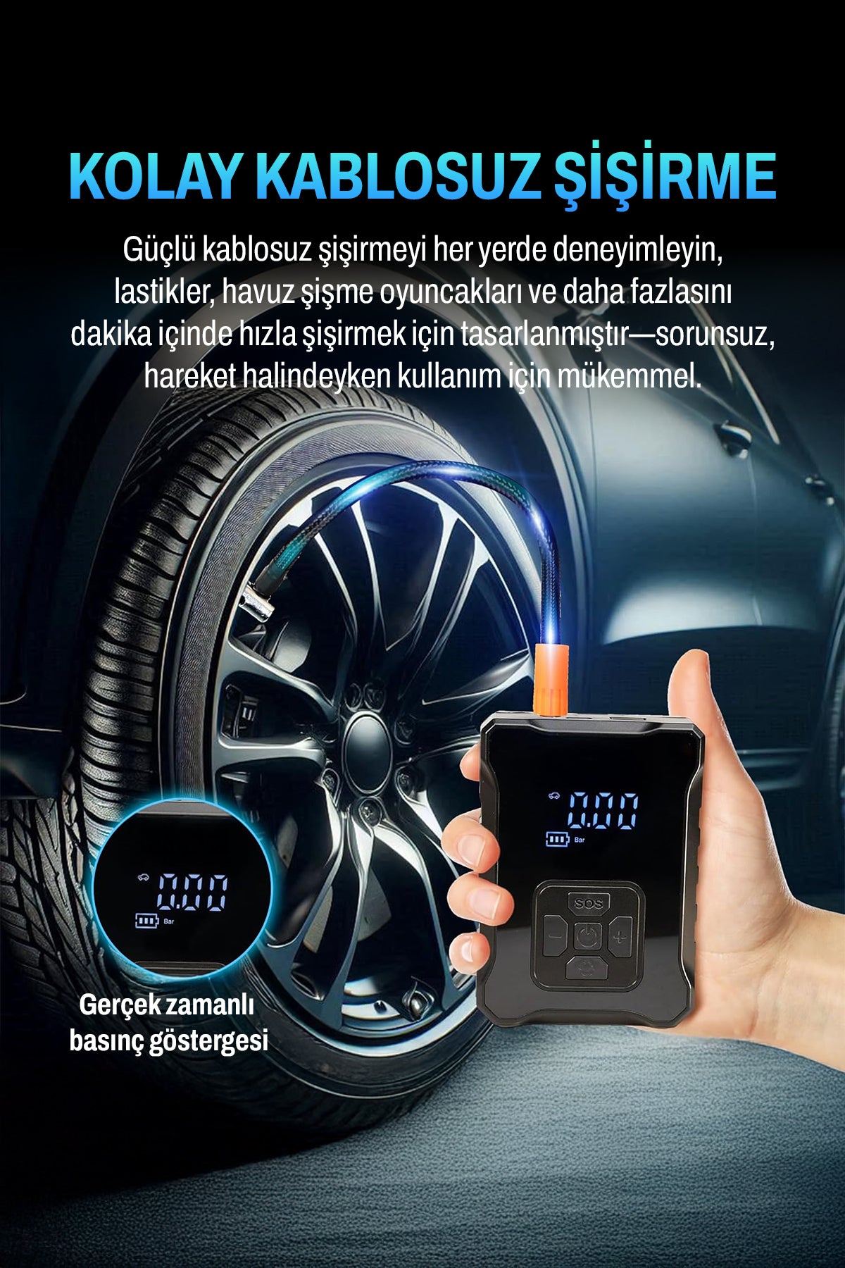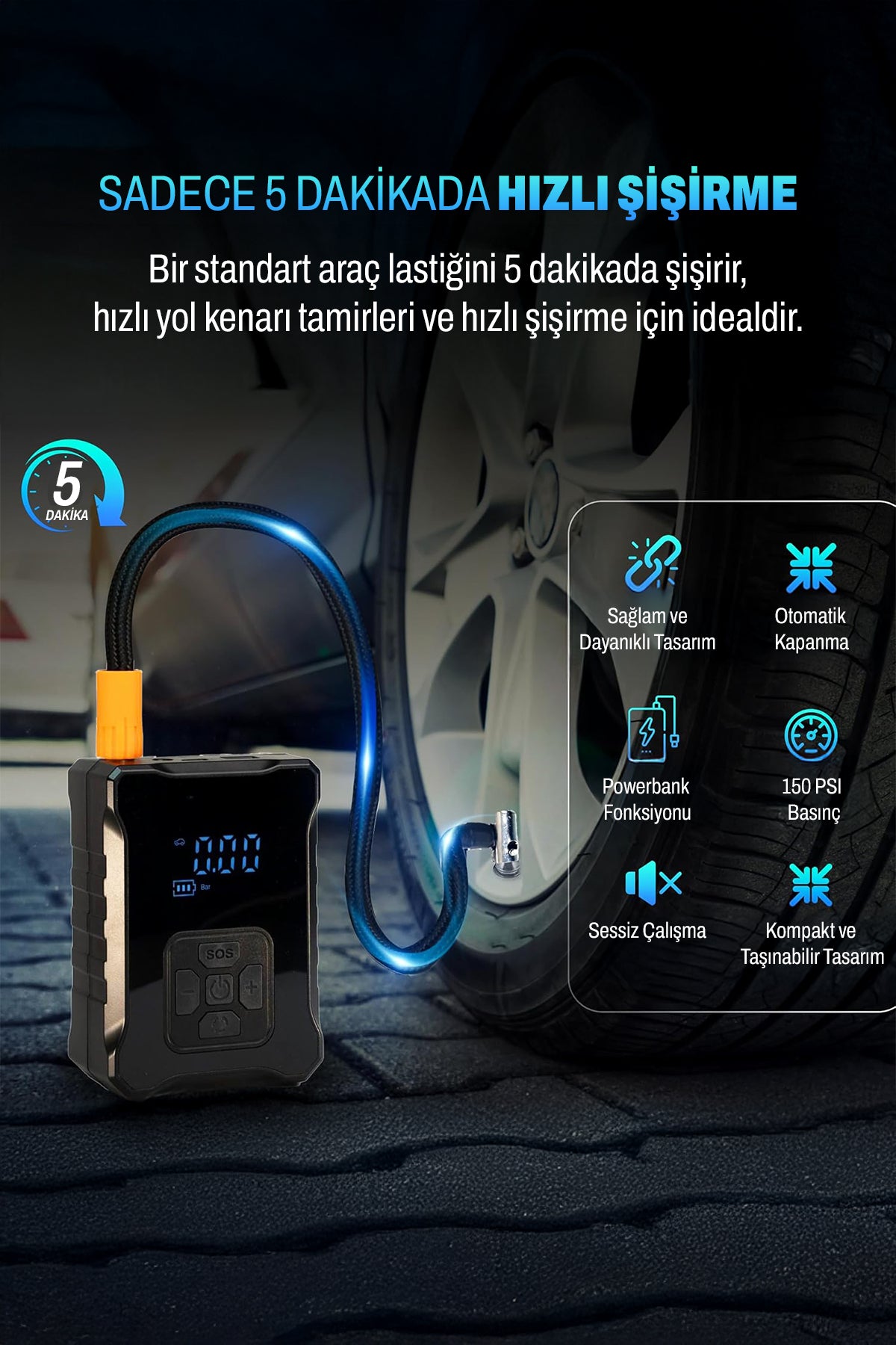 • 🚗 5 Dakikada Hızlı Şişirme:Standart bir araç lastiğini 4-5 dakika içinde şişirir.