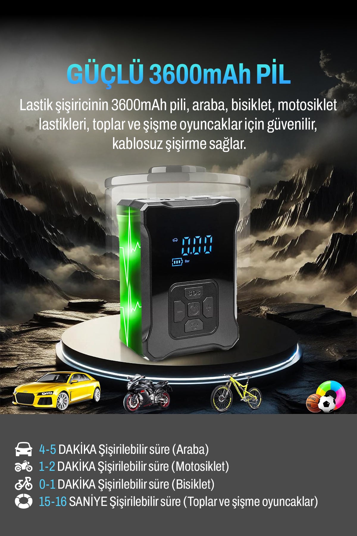 • 🔋 Güçlü 3600mAh Batarya:Kablosuz kullanım, her ortamda güvenli ve pratik şişirme.